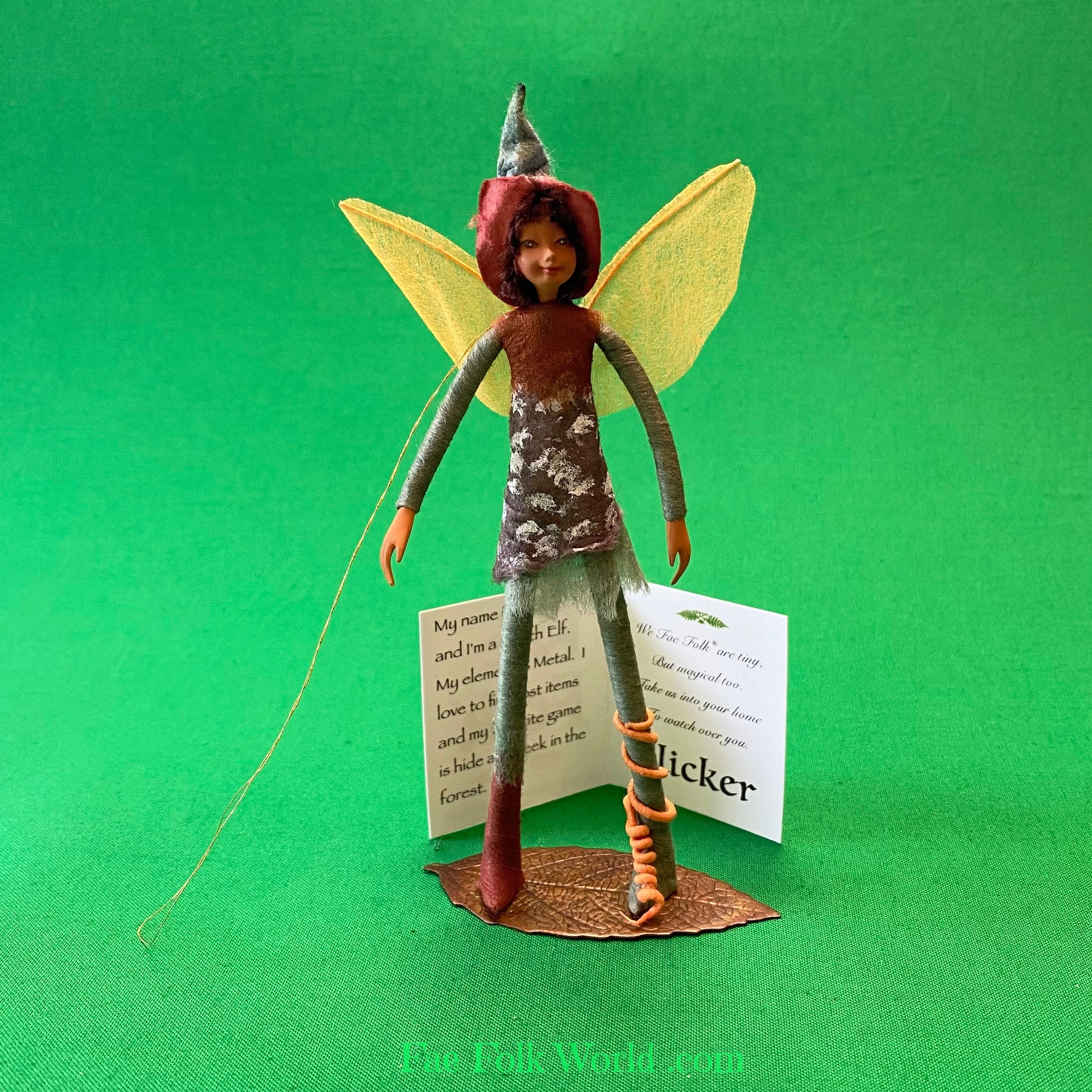 This one says; "My name is Flicker and I'm a Earth Elf. My element is Metal. I love to find lost items and my favorite game is hide and seek in the forest."