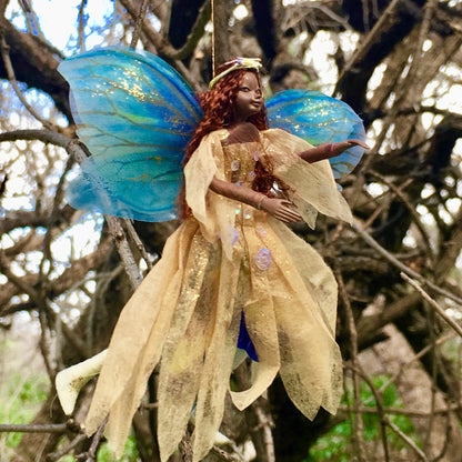 Each ornamental fairy comes boxed with a metal leaf to stand on as they have magical magnets in their tiny shoes. They are bendable so they can sit as well, and posable with the wiring in their arms and legs and wings. They also come with a golden thread attached to their backs so they can hang.