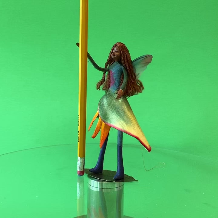Each ornamental fairy comes boxed with a metal leaf to stand on as they have magical magnets in their tiny shoes. They are bendable so they can sit as well, and posable with the wiring in their arms and legs and wings. They also come with a golden thread attached to their backs so they can hang.