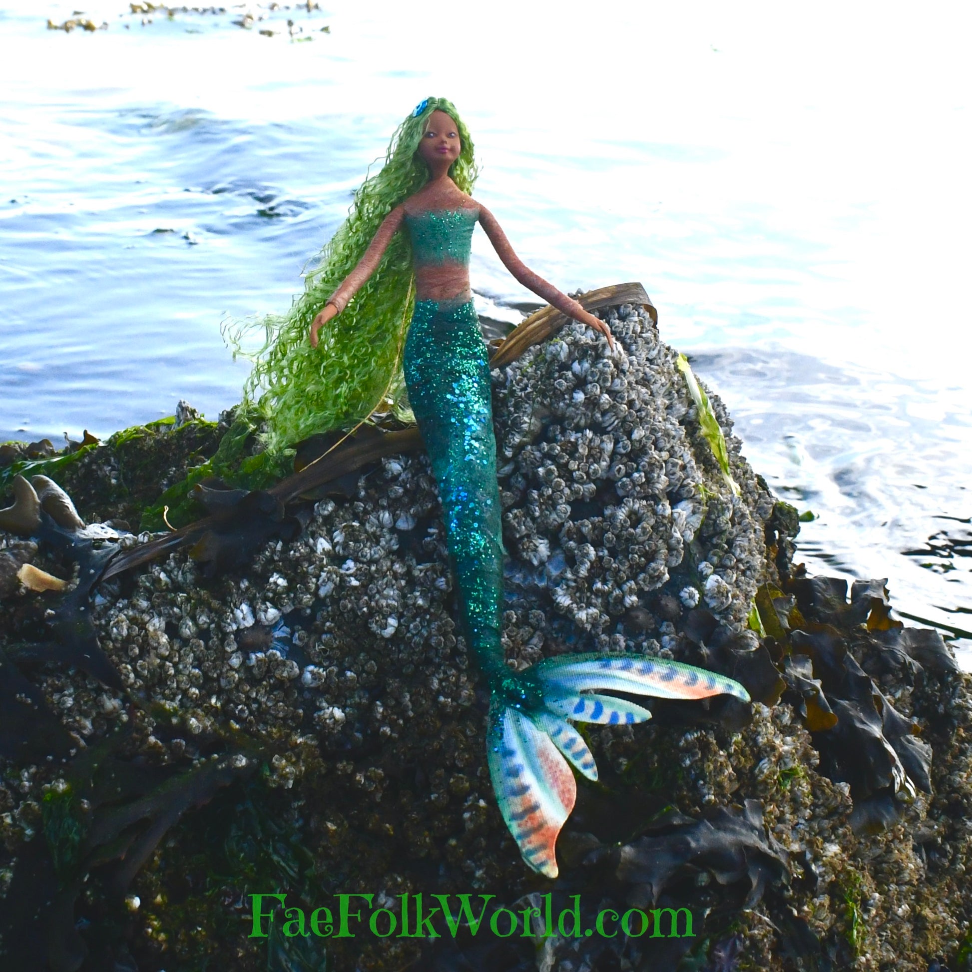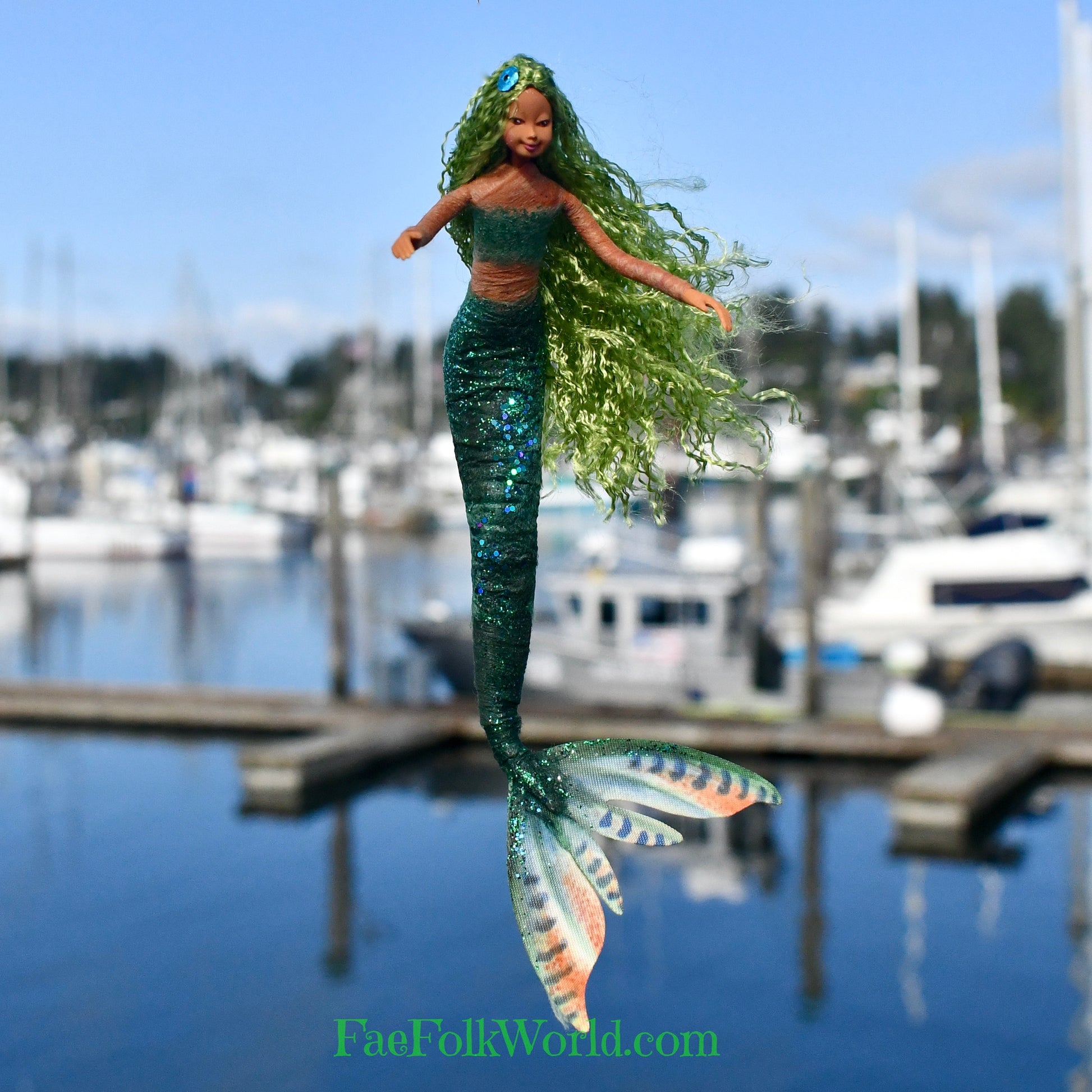 Each ornamental mermaid comes in a clear box. Their arms and tails are bendable and they come with a golden thread attached to their backs so they can hang. (The fairy mermaids have magical magnets in their bottoms, but do not come with the metal leaves like the other fairies.)